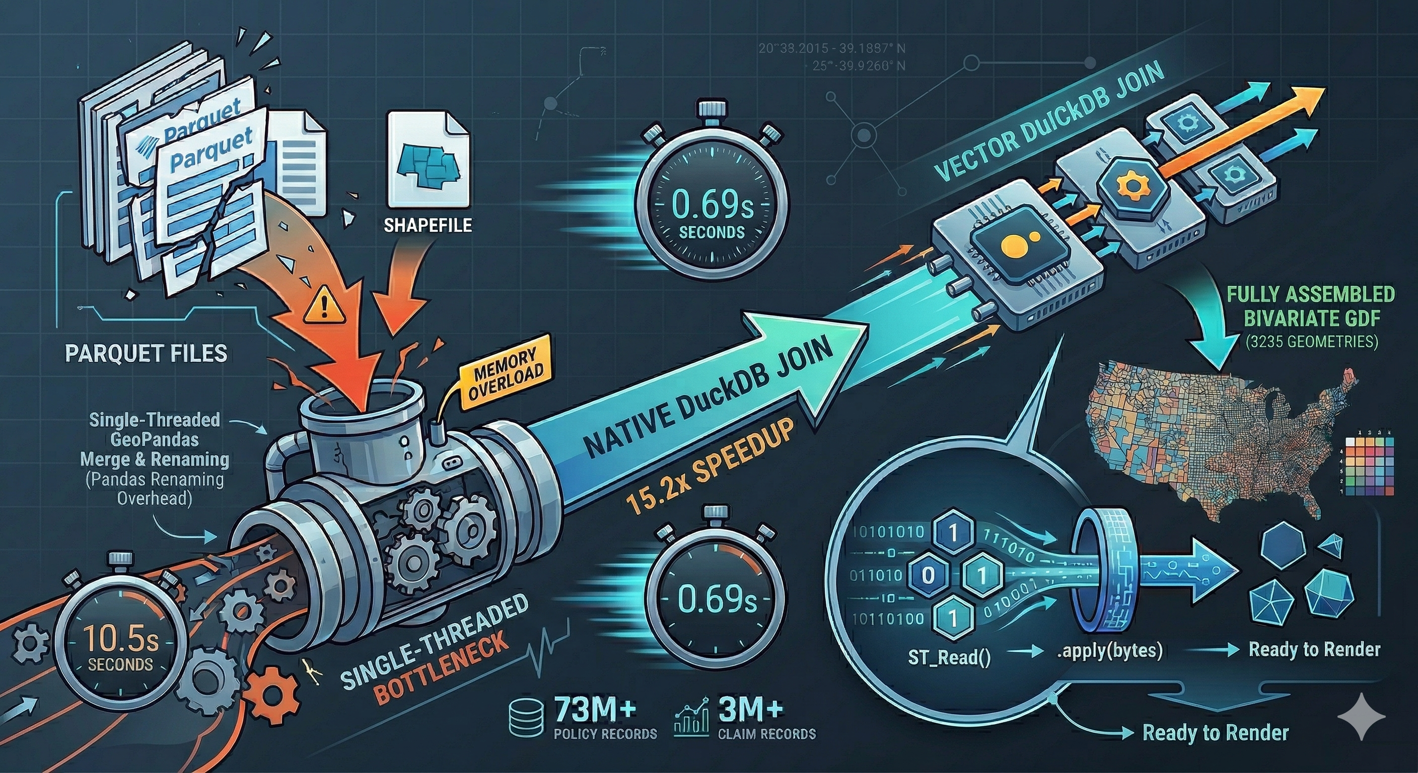 How switching to DuckDB’s spatial extension cut execution time from 10.5s to 0.69s on large FEMA NFIP datasets.